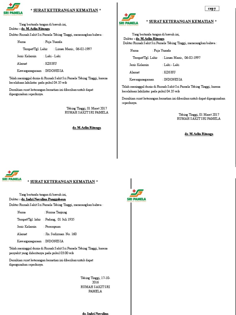 Dengan begitu laporan kita akan diproses dan akan dibuatkan surat kematian ini. Dengan mencari langsung contohnya di google mungkin kita bisa mendapatkan format surat keterangan kematian yang kita butuhkan jika kita menggunakan kode di atas. Staf departemen penelitian dan pengembangan (research and development). Demikian surat keterangan kematian ini kami buat sejujur jujurnya diberikan untuk dapat dipergunakan sebagaimana mestinya. Surat keterangan kematian tidak kalah pentingnya dari akte kelahiran, selain sebagai untuk pengurusan administrasi, tetap juga sebagai alat pemerintahan untuk mendata jumlah kematian. Surat keterangan kematian adalah sebuah surat yang dikeluarkan oleh kelurahan atau desa untuk menerangkan bahwa seseorang telah meninggal dunia. Berikut draf contoh lampiran form pengisianya. Untuk mendapatkan pelayanan pencatatan kematian harus melengkapi persyaratan berikut surat keterangan kematian dari rumah sakit, puskesmas atau visum dokter, asli dan fotokopi kk dan ktp almarhum dan pemohon Contoh surat pernyataan ahli waris jual beli tanah. Contoh surat keterangan kematian rumah sakit. Kematian lebih 10 tahun harus ke pengadilan masyarakat di minta. Namun beberapa bank hanya melayani pembuatan rekening untuk masyarakat yang berdomisili di daerah pelayanan bank tersebut. Contoh surat keterangan kematian rating: